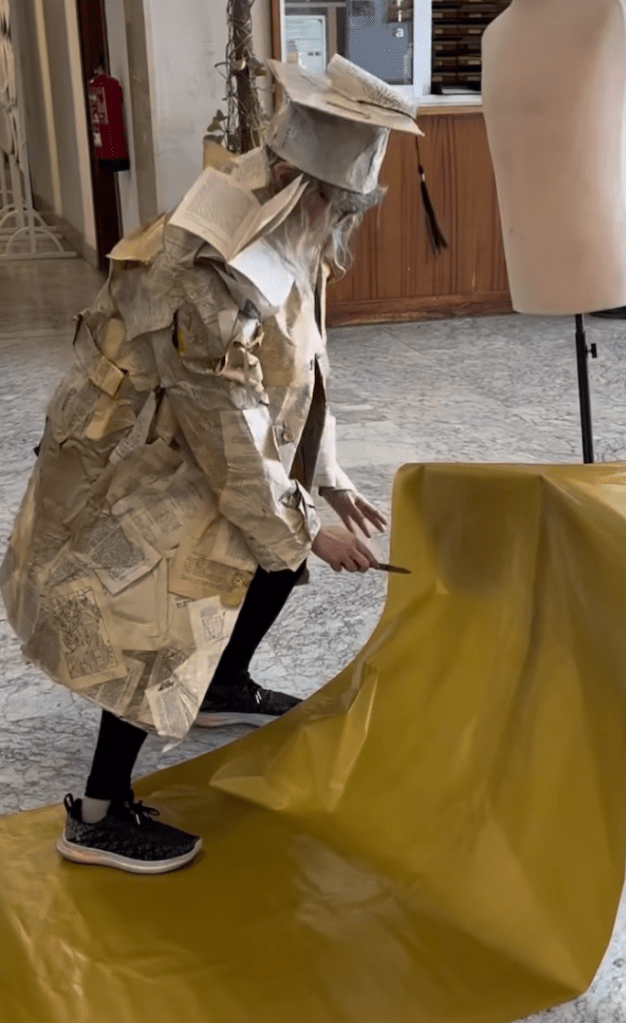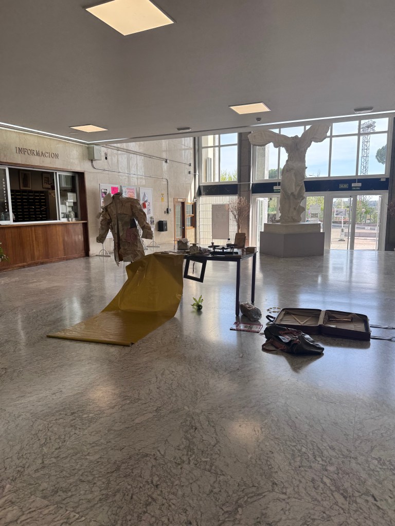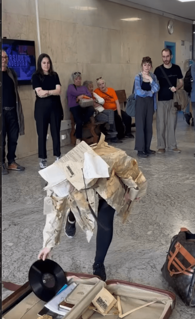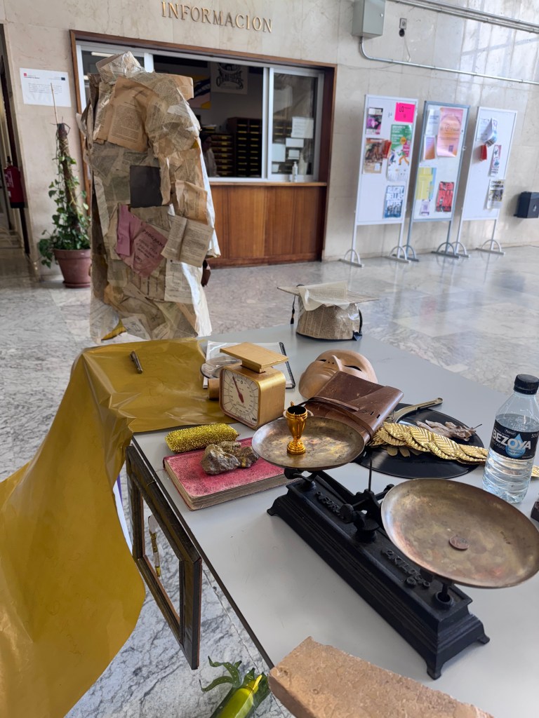 This inquiry culminated in Peso Acedémico ( Academic Weight) Acción Spring(t), Complutense University of Madrid, 2025, where academic documents were weighed alongside absurd gold-covered objects, shifting the question of value from the measurable toward the symbolic: what truly carries weight — thought itself, or its certification?