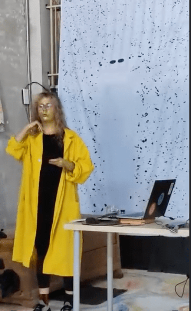 Her first activation, Advanced Explorations: Innovative Perspectives on Unexplored Phenomena, consisted of deliberately absurd micro-lectures such as The Importance of Counting Sand and The Sound of Crickets on Mars, exposing how authority can be constructed through form, language, and staging alone. Gold functioned simultaneously as armor and symptom — a seductive surface promising value while concealing structural fragility.