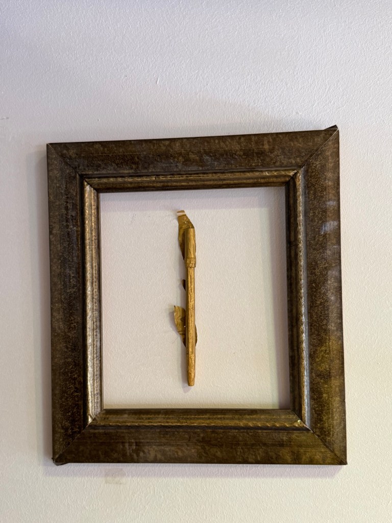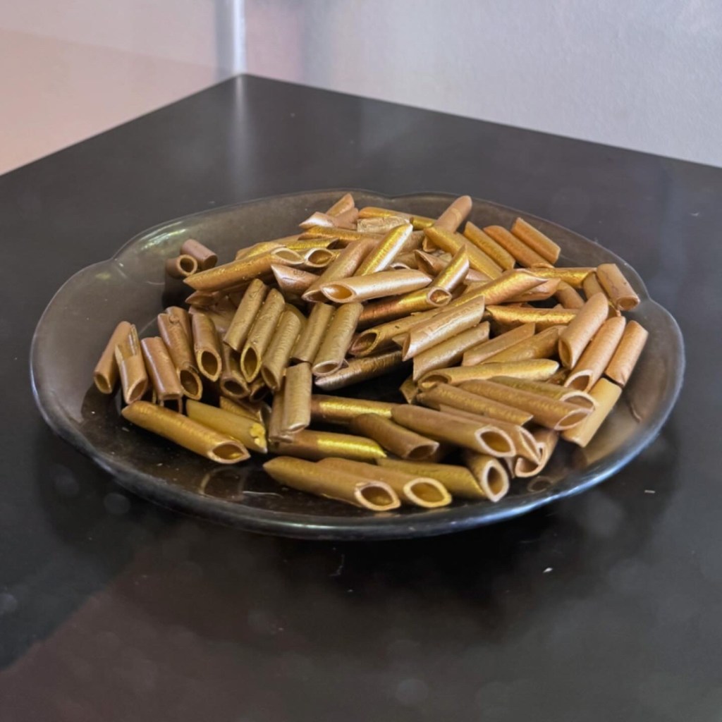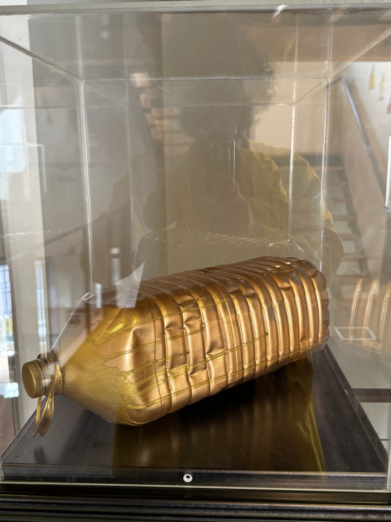 The project later expanded into installation through the Golden Archive, a constellation of everyday objects coated in gold — a childhood pen, a plastic container, a mask, a plate of golden macaroni — ironizing the commodification of knowledge and the confusion between visibility and depth.